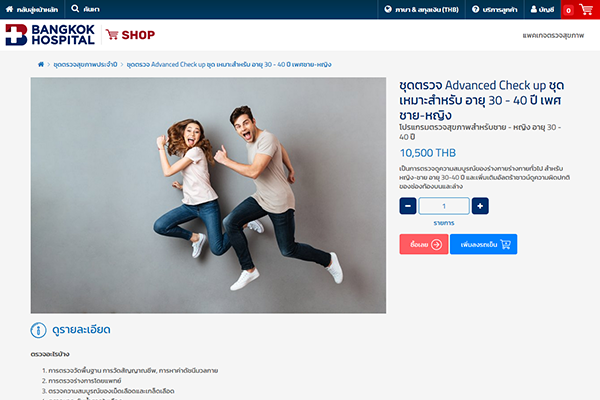 2 เลือกชุดตรวจสุขภาพ พร้อมระบุจำนวนชุดตรวจที่ต้องการจะซื้อ จากนั้นกดปุ่ม "เพิ่มลงรถเข็น" หรือ กดที่สัญลักษณ์รถเข็นของชุดตรวจสุขภาพที่ท่านต้องการซื้อ -